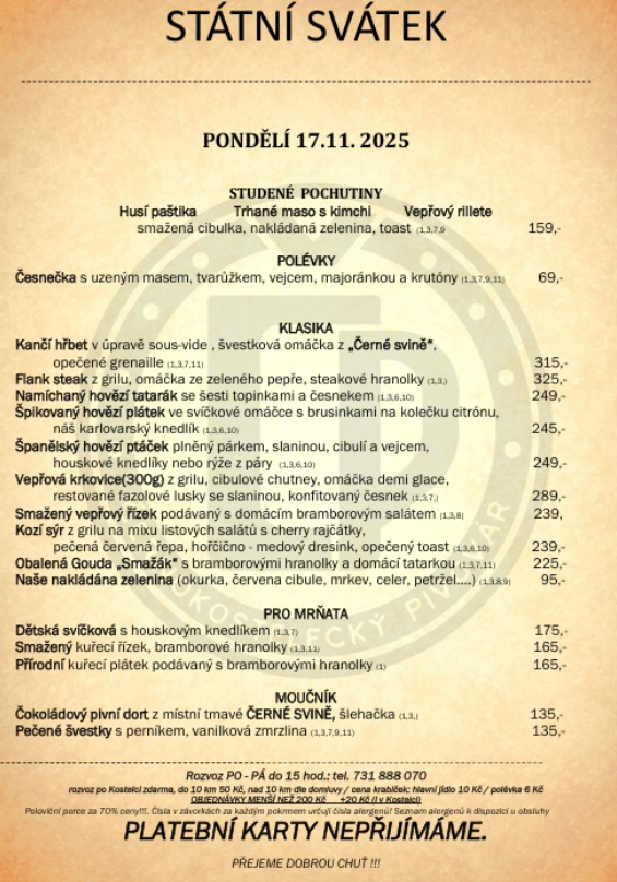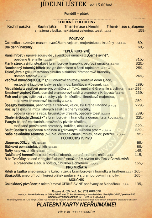 Jídelní lístek platné Po-Pa od 15:00 hodin.